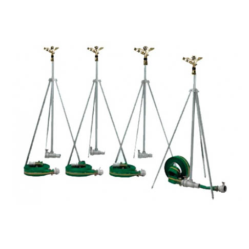 Setul contine: 4 suporti din teava de aluminiu cu inaltime de 1.8m, 4 capuri de aspersor din alama, fitinguri si 4 role furtun plat din PVC usor de manevrat.
